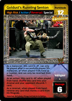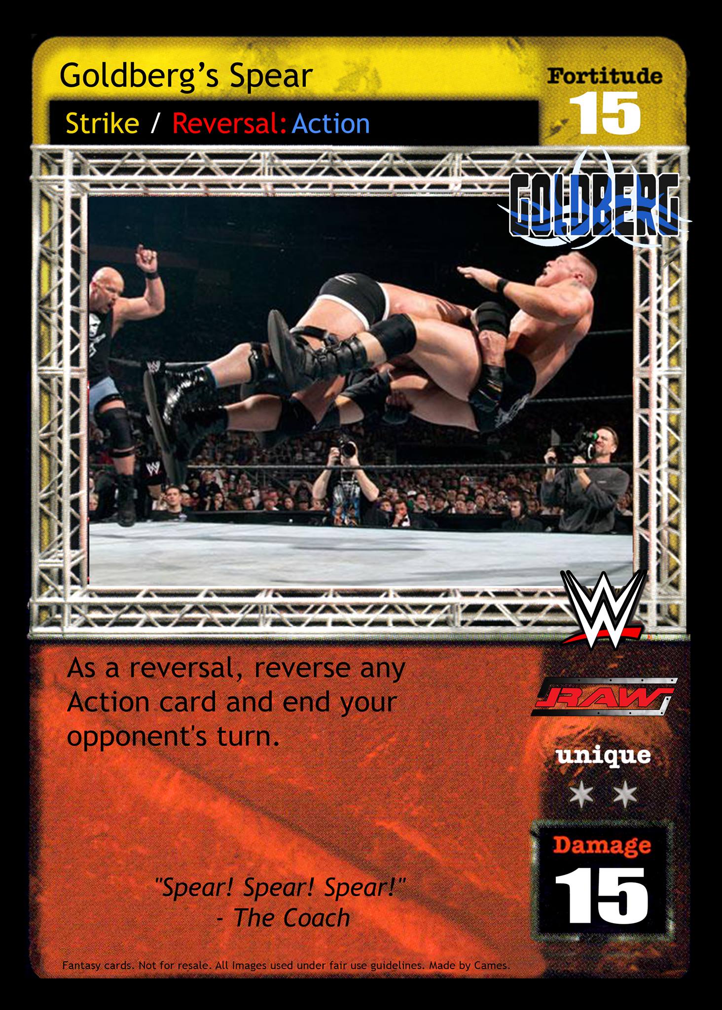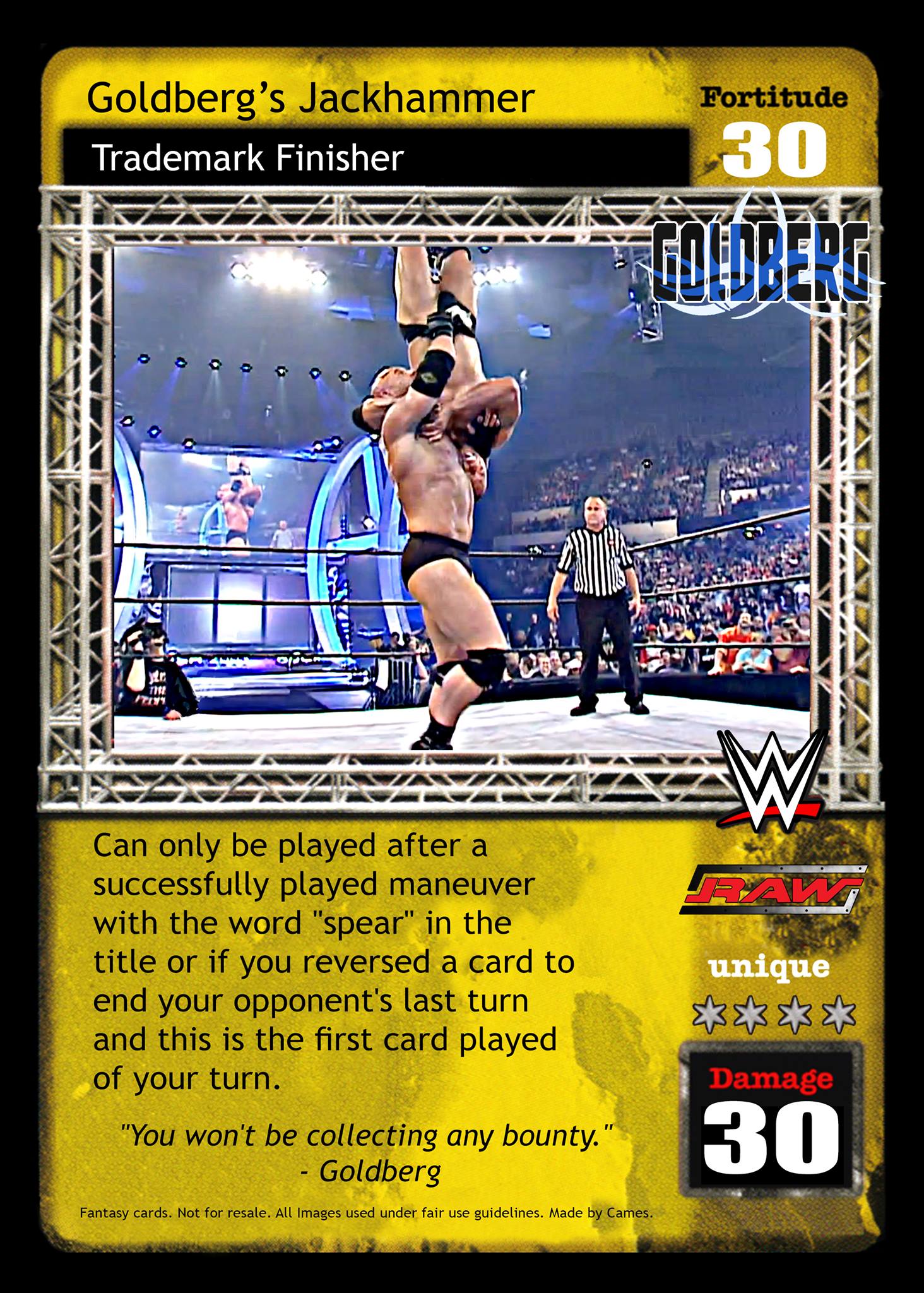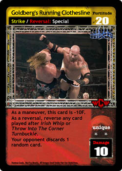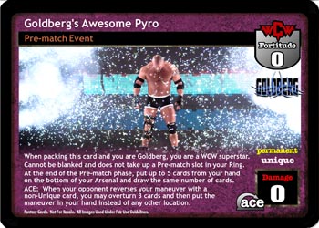 When packing this card and you are Goldberg, you are a WCW superstar. Cannot be blanked and does not take up a Pre-match slot in your Ring. At the end of the Pre-match phase, put up to 5 cards from your hand on the bottom of your Arsenal and draw the same number of cards. ACE: When your opponent reverses your maneuver with a non-Unique card, you may overturn 3 cards and then put the maneuver in your hand instead of any other location.