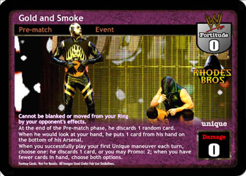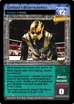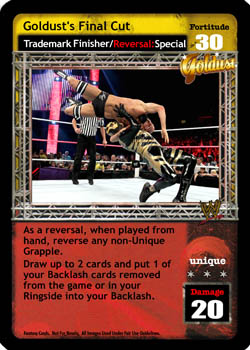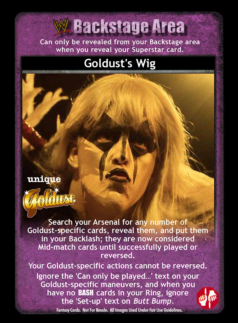 Search your Arsenal for any number of Goldust-specific cards, reveal them, and put them in your Backlash deck; they are now considered Mid-match cards until successfully played or reversed. Your Goldust-specific actions cannot be reversed. Ignore the 'Can only be played...' text on your Goldust-specific maneuvers, and when you have no BASH cards in your Ring, ignore the 'Set-up' text on Butt Bump.