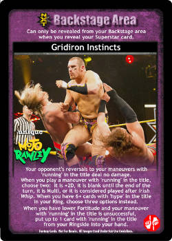 Your opponent's reversals to your maneuvers with 'running' in the title deal no damage. When you play a maneuver with 'running' in the title, choose two: it is +2D, it is blank until the end of the turn, it is Multi, or it is considered played after Irish Whip. When you have 6+ cards with 'hype' in the title in your Ring, choose three options instead. When you have lower Fortitude and your maneuver with 'running' in the title is unsuccessful, put up to 1 card with 'running' in the title from your Ringside into your hand.