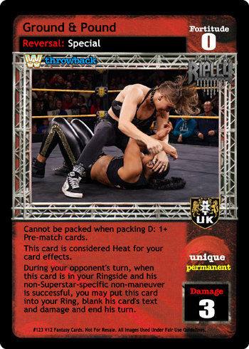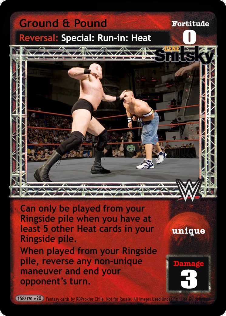 Can only be played from your Ringside pile when you have at least 5 other Heat cards in your Ringside pile. When played from your Ringside pile, reverse any non-unique maneuver and end your opponent's turn.