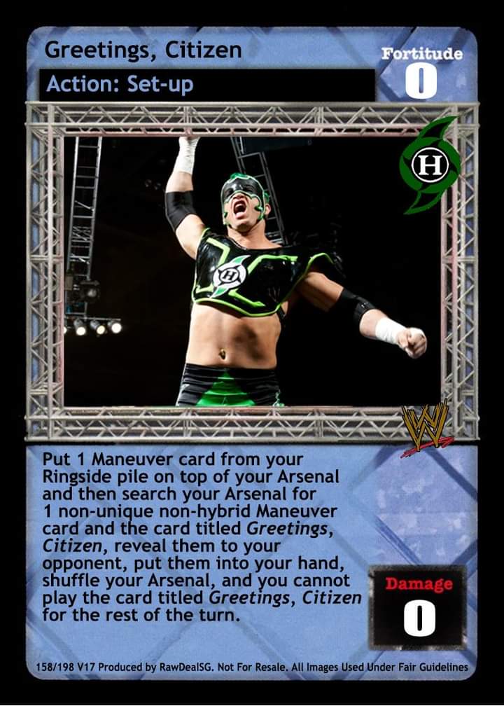 Put 1 Maneuver card from your Ringside pile on top of your Arsenal and then search your Arsenal for 1 non-unique non-hybrid Maneuver card and the card titled Greetings, Citizen, reveal them to your opponent, put them into your hand, shuffle your Arsenal, and you cannot play the card titled Greetings, Citizen for the rest of the turn.