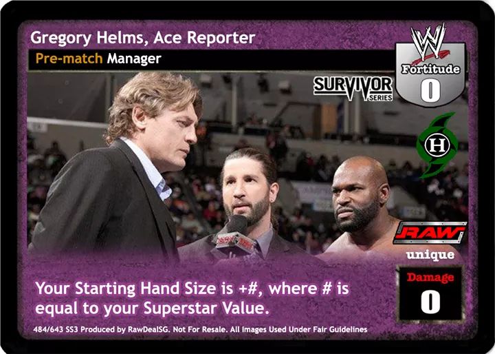 Cannot be packed when packing D: 1+ Pre-match cards. This card is considered Heat for your card effects. During your opponent's turn, when this card is in your Ringside and his non-Superstar-specific non-maneuver is successful, you may put this card into your Ring, blank his card's text and damage and end his turn.
