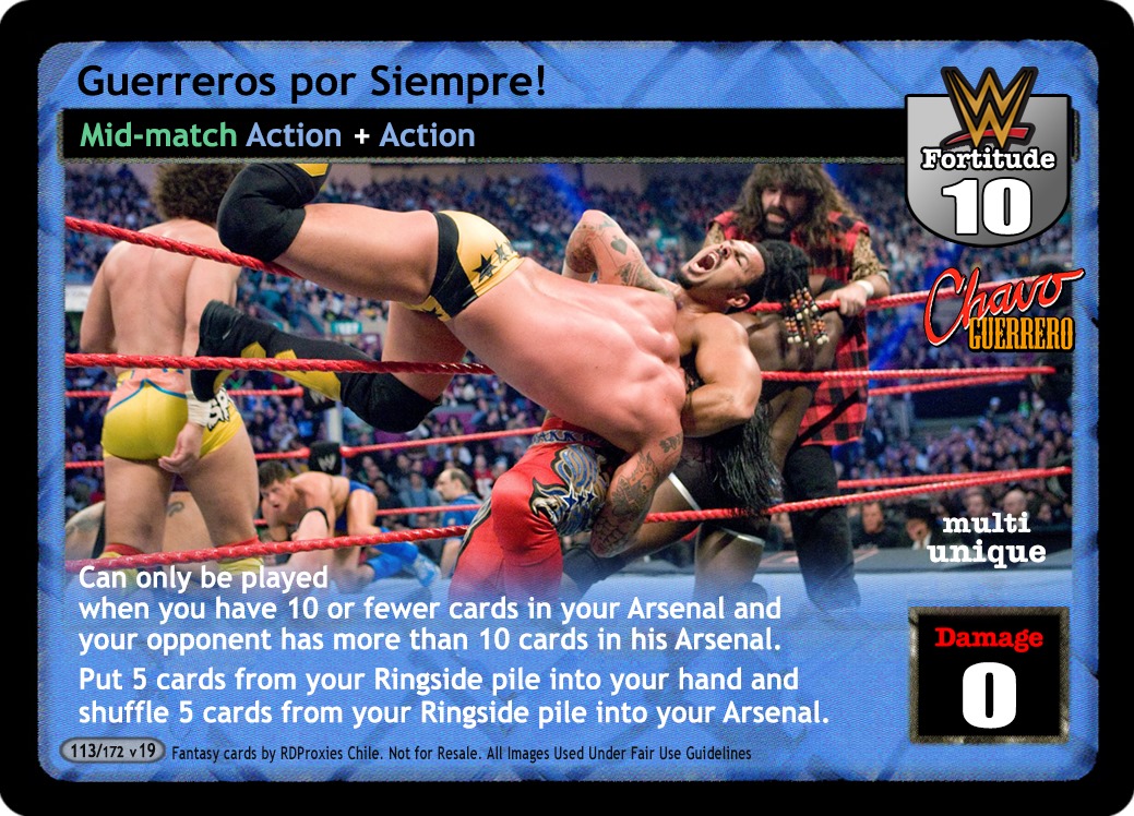Can only be played when you have 10 or fewer cards in your Arsenal and your opponent has more than 10 cards in his Arsenal. Put 5 cards from your Ringside pile into your hand and shuffle 5 cards from your Ringside pile into your Arsenal.