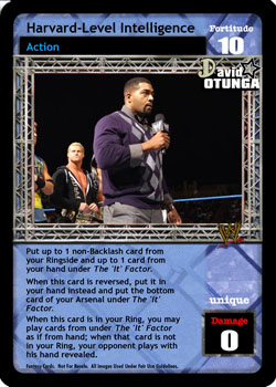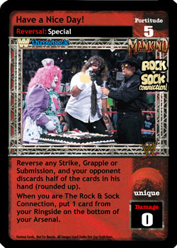 Reverse any Strike, Grapple or Submission, and your opponent discards half of the cards in his hand (rounded up). When you are The Rock and Sock Connection, put 1 card from your Ringside on the bottom of your Arsenal.