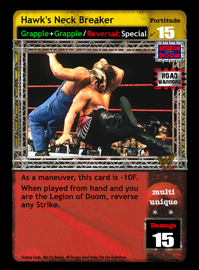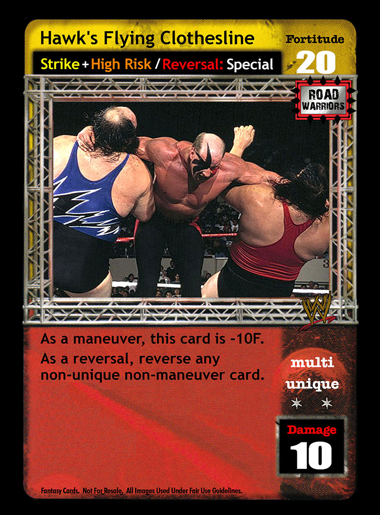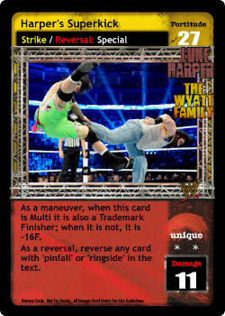 As a maneuver, when this card is Multi it is also a Trademark Finisher; when it is not, it is -16F. As a reversal, reverse any card with 'pinfall' or 'ringside' in the text.