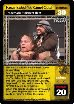 This card is +3D for each Camel Clutch in your Ring. Search your Arsenal for Maintain Hold, reveal it, put it in your hand, and shuffle. When it is the next card played this turn, you may ignore the 'Can only be played...' text, and it can only be reversed by Unique reversals. When this card is unsuccessfully played from your Ringside, you must discard 2 cards or remove it from the game.