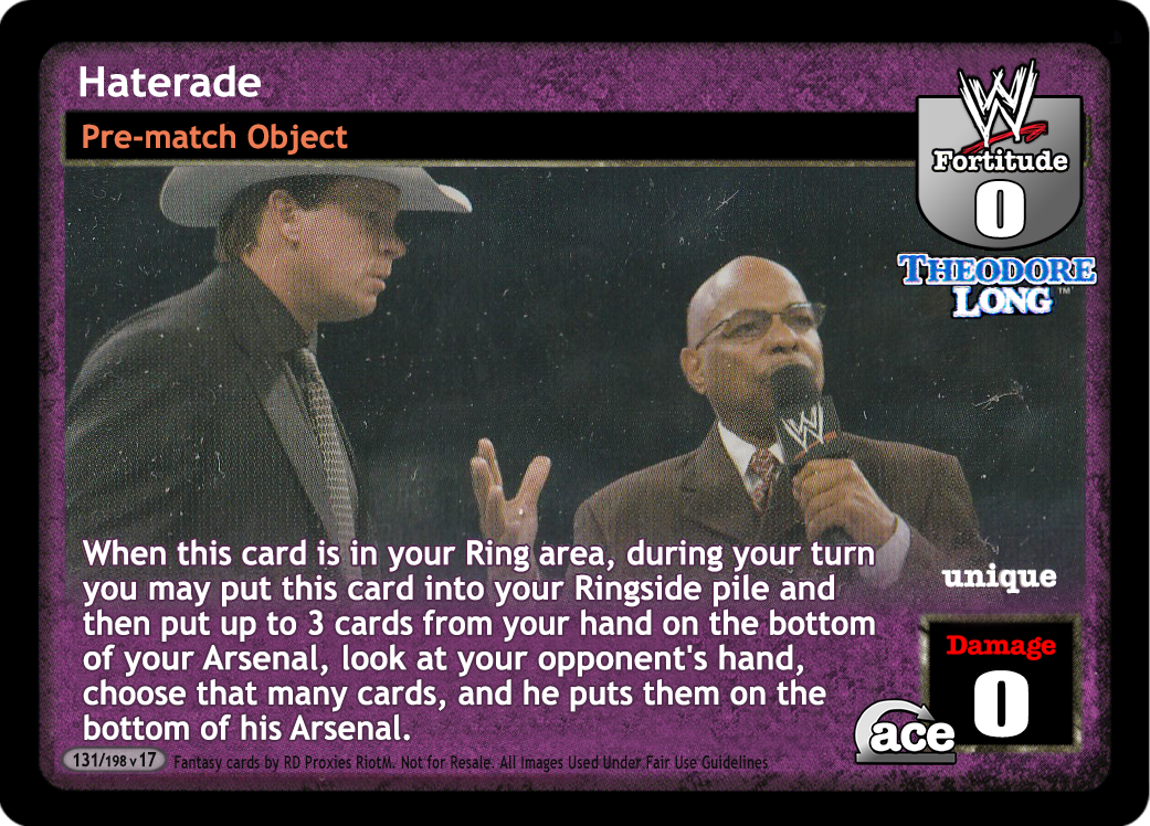 When this card is in your Ring area, during your turn you may put this card into your Ringside pile and then put up to 3 cards from your hand on the bottom of your Arsenal, look at your opponent's hand, choose that many cards, and he puts them on the bottom of his Arsenal.