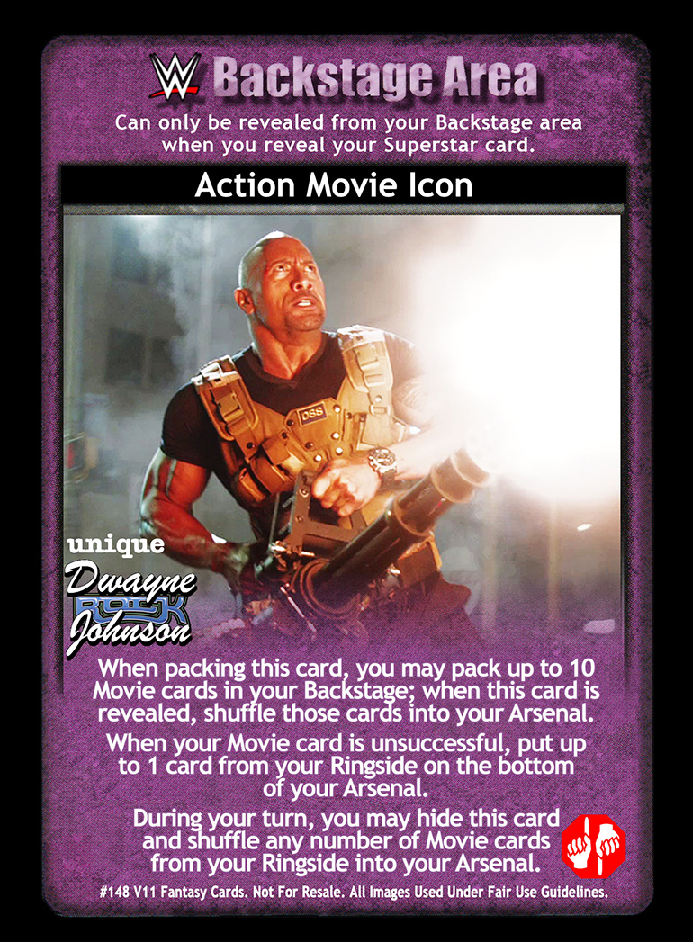 When packing this card, you may pack up to 10 Movie cards in your Backstage; when this card is revealed, shuffle those cards into your Arsenal. When your Movie card is unsuccessful, put up to 1 card from your Ringside on the bottom of your Arsenal. During your turn, you may hide this card and shuffle any number of Movie cards from your Ringside into your Arsenal.