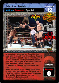 As an action, when you are Evolution this card is F: 0. Search your Arsenal and Ringside for 1 Evolution-specific card, reveal it, put it in your hand and shuffle; when that card is your next card played as an action this turn, your opponent cannot respond to it. As a reversal, reverse any non-maneuver card. When this card is in your Ring, the number of your cards removed from the game for If You Want to Play, You Gotta Pay is reduced to 0, and he does not draw for your Gentlemen's Establishment.