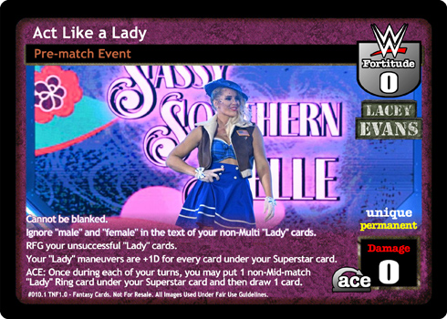 Cannot be blanked. Ignore 'male' and 'female' in the text of your non-Multi cards with 'lady' in the title. Your unsuccessfully played cards with 'lady' in title are removed from the game. ACE: Once during each of your turns, you may put 1 non-Mid-match card with 'lady' in the title from your Ring under your Superstar card and then draw 1 card. Your maneuvers with 'lady' in the title are +1D for every card under your Superstar card.