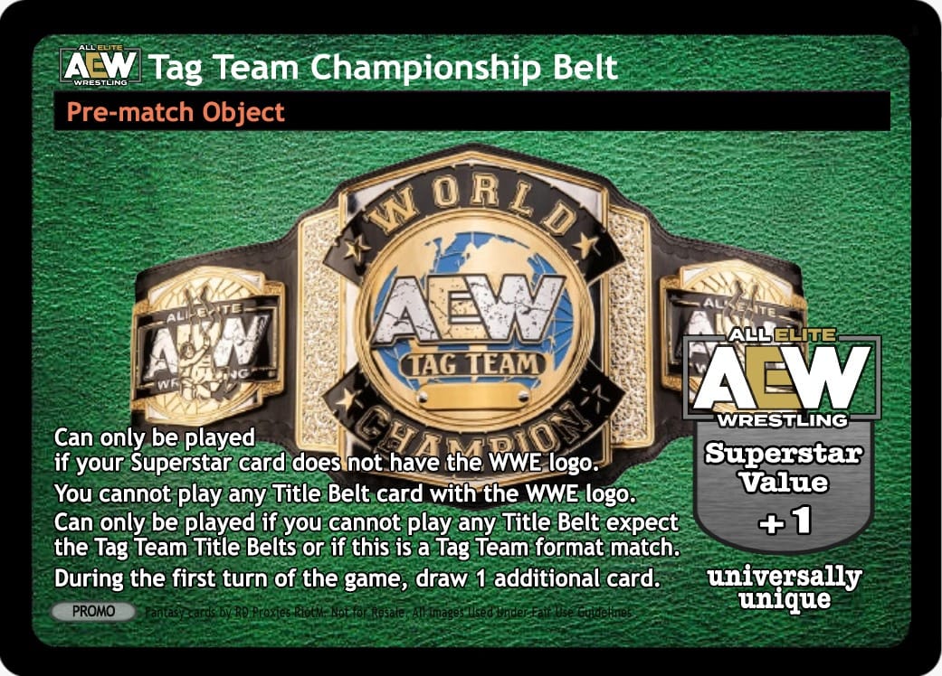 Can only be played if your Superstar card does not have the WWE logo. You cannot play any Title Belt card with the WWE logo. Can only be played if you cannot play any Title Belt expect the Tag Team Title Belts or if this is a Tag Team format match. During the first turn of the game, draw 1 additional card.