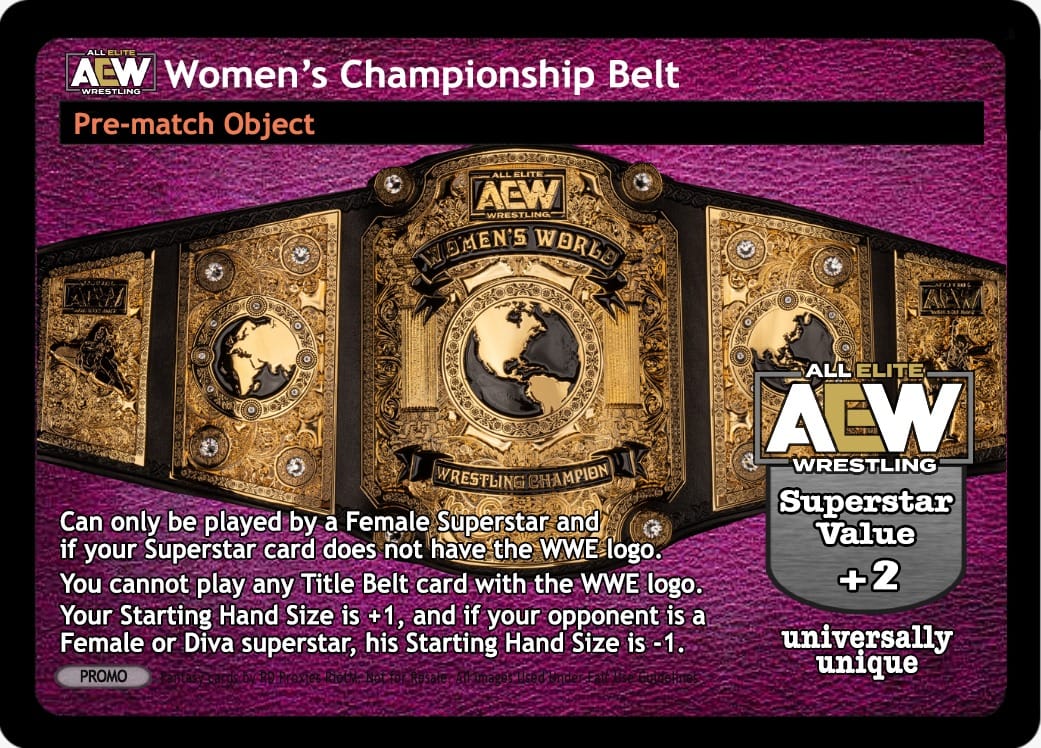 Can only be played by a Female Superstar and if your Superstar card does not have the WWE logo. You cannot play any Title Belt card with the WWE logo. Your Starting Hand Size is +1, and if your opponent is a Female or Diva superstar, his Starting Hand Size is -1.