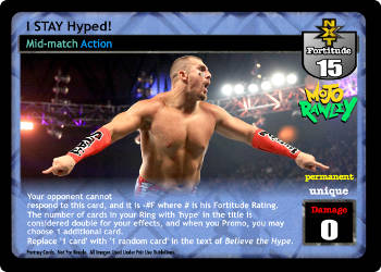 Your opponent cannot respond to this card, and it is -#F where # is his Fortitude Rating. The number of cards in your Ring with 'hype' in the title is considered double for your effects, and when you Promo, you may choose 1 additional card. Replace '1 card' with '1 random card' in the text of Believe the Hype.