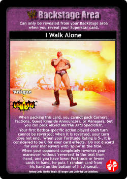 When packing this card, you cannot pack Corners, Factions, Guest Ringside Announcers, or Managers, but you can pack Mixed Martial Arts Specialist. Your first Batista-specific action played each turn cannot be reversed; when it is reversed, your turn does not end. When your Fortitude Rating is 5-, it is considered to be 0 for your card effects. Do not discard for your maneuvers with 'spine' in the title. When your opponent completely reverses your maneuver without 'reversed' in the text from hand, and you have lower Fortitude or fewer cards in hand, he puts 1 random card from his hand on the bottom of his Arsenal.