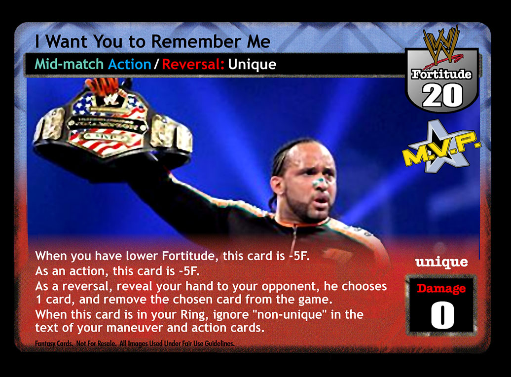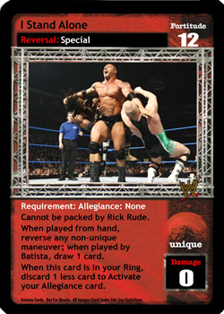 Requirement: Allegiance: None. Cannot be packed by Rick Rude. When played from hand, reverse any non-unique maneuver; when played by Batista, draw 1 card. When this card is in your Ring, discard 1 less card to Activate your Allegiance card.