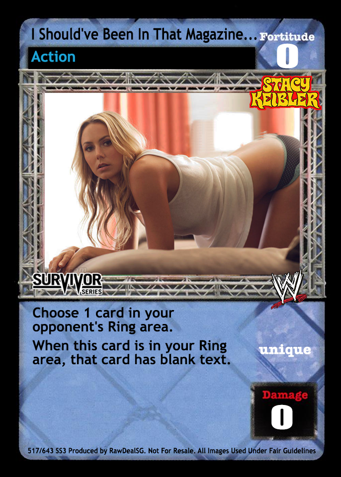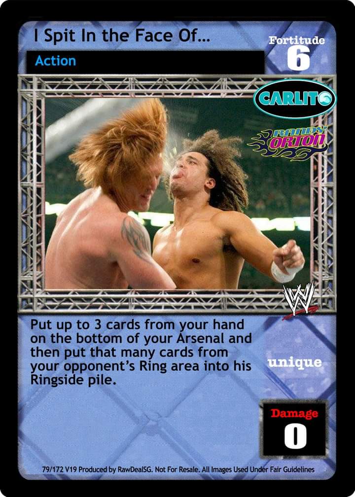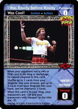 When your opponent has a nWo or ECW card in his Ring or Backstage, he cannot respond to this card. Shuffle up to 3 cards from your Ringside into your Arsenal, put up to 3 cards from your Ringside into your hand, and he overturns 3 cards. When this card is in your Ring, your maneuvers are +2D and your maneuvers with 'sleeper' in the title are -3F.