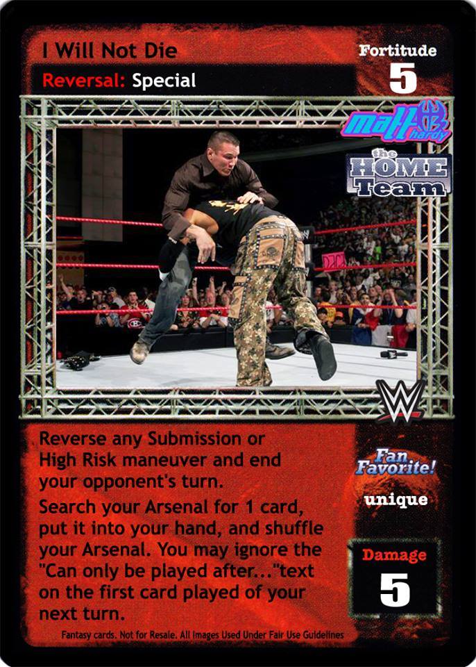 Reverse any Submission or High Risk maneuver and end your opponent's turn. Search your Arsenal for 1 card, put it into your hand, and shuffle your Arsenal. You may ignore the "Can only be played after..." text on the first card played of your next turn.