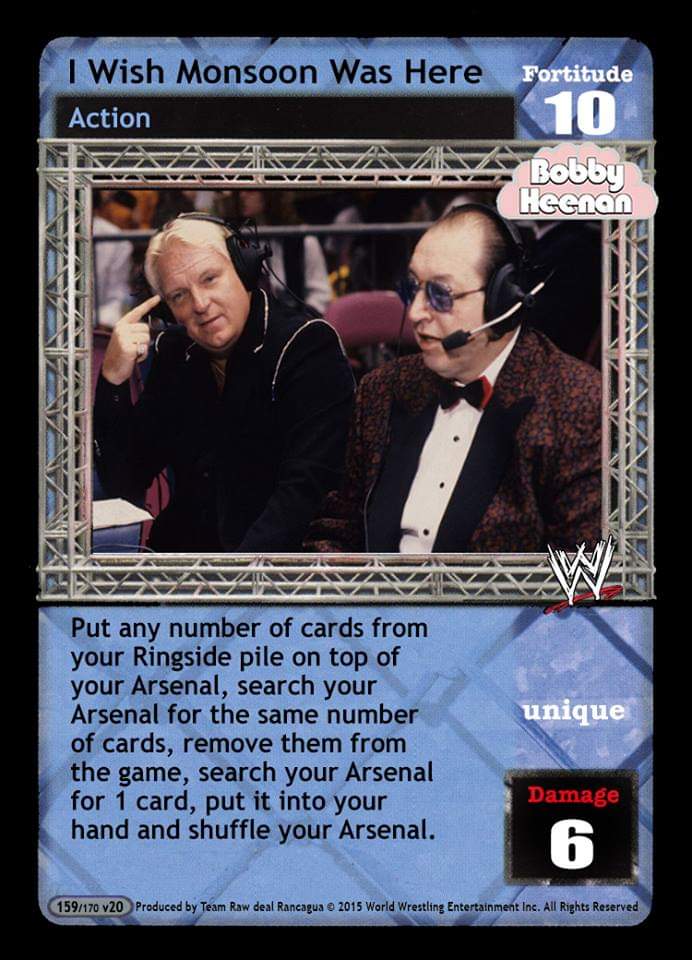 Put any number of cards from your Ringside pile on top of your Arsenal, search your Arsenal for the same number of cards, remove them from the game, search your Arsenal for 1 card, put it into your hand, and shuffle your Arsenal.