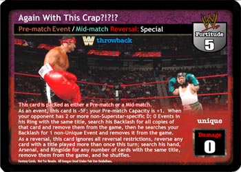 This card is packed as either a Pre-match or a Mid-match. As an event, this card is -5F; your Pre-match Capacity is +1. When your opponent has 2 or more non-Superstar-specific D:0 Events in his Ring with the same title, search his Backlash for all copies of that card and remove them from the game, then he searches your Backlash for 1 non-Unique Event and removes it from the game. As a reversal, this card ignores all reversal restrictions, reverse any card with a title played more than once this turn. Search his hand, Arsenal, and Ringside for any number of cards with the same title, remove them from the game, and he shuffles.
