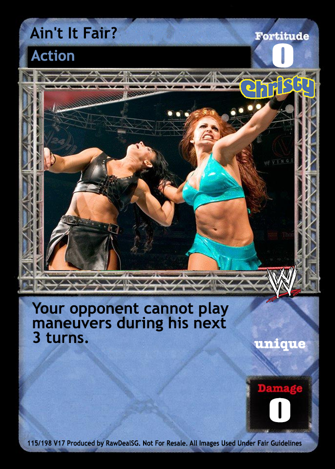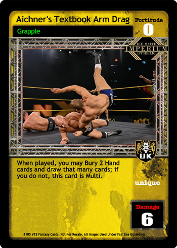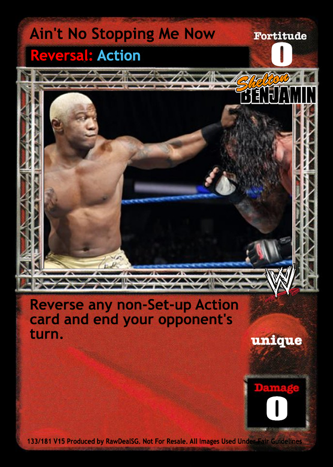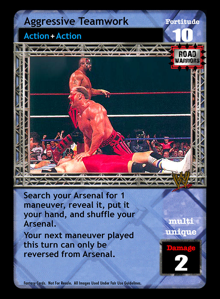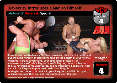 Reverse any non-Trademark Finisher maneuver, draw up to 4 cards, and put the same number of cards from hand on the bottom of your Arsenal. When this card is in your Ring, your opponent's printed F: 4+ maneuvers are +4F, his Volley cards are Volley: -4, discard 1 less card to play reversals to his Chain cards, and he must have 4 additional Heat cards in his Ringside to play Heat cards from Ringside. During his turn when this card is in your Ring, he may remove 4 cards in his hand from the game and then you put this card into your Ringside.