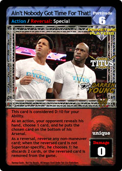 This card is considered D:10 for your Ability. As an action, your opponent reveals his hand, choose 1 card, and he puts the chosen card on the bottom of his Arsenal. As a reversal, reverse any non-maneuver card; when the reversed card is not Superstar-specific, he chooses 1: he discards 2 cards, or the reversed card is removed from the game.