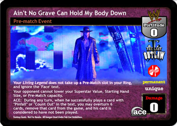 Your Living Legend does not take up a Pre-match slot in your Ring, and ignore the 'Face' text. Your opponent cannot lower your Superstar Value, Starting Hand Size, or Pre-match capacity. ACE: During any turn, when he successfully plays a card with 'Pinfall' or 'Count Out' in the text, you may overturn 6 cards, remove that card from the game, and his card is considered to have not been played.