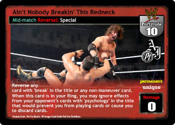 Reverse any card with 'break' in the title or any non-maneuver card. When this card is in your Ring, you may ignore effects from your opponents cards with 'psychology' in the title that would prevent you from playing cards or cause you to discard cards.