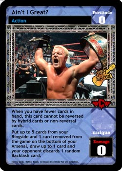 When you have fewer cards in hand than your opponent, this card cannot be reversed by hybrid cards or non-reversal cards. Put up to 5 cards from your Ringside and 1 card removed from the game on the bottom of your Arsenal, draw up to 1 card and your opponent discards 1 random Backlash card.
