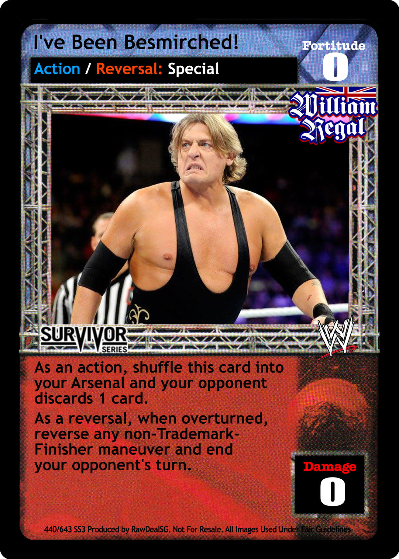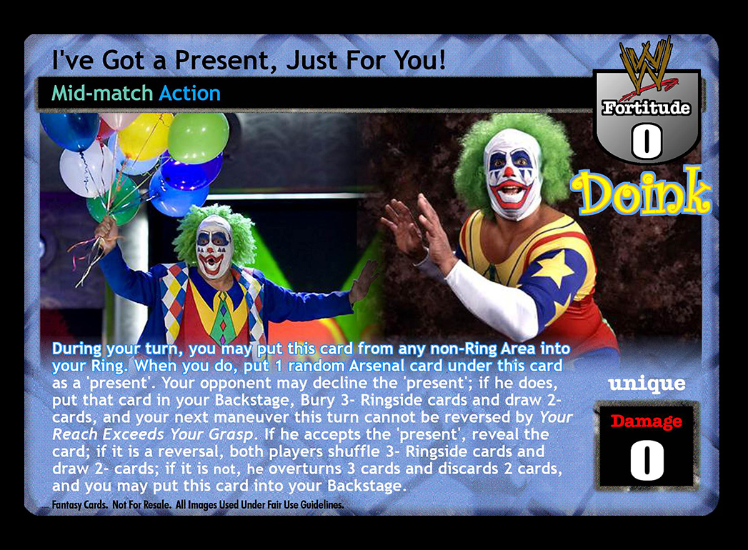 During your turn, you may put this card into your Ring. When you do, put 1 random card from your Arsenal underneath as a µpresent'. Your opponent may decline the µpresent'; if he does, shuffle it and up to 3 cards from your Ringside into your Arsenal, and draw up to 2 cards. If he accepts the µpresent', reveal the card: If it is a reversal, remove it from the game. If it is an non-hybrid action or antic, put it in your Ringside, he may shuffle up to 3 cards from his Ringside into his Arsenal and draw up to 2 cards. If it is a non-hybrid maneuver, you may play it as if it were in your hand and he cannot play reversals to it; if it is not a legal play, put it into your Backstage Area instead.