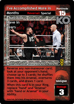 As an action, shuffle this card into your Arsenal and your opponent discards 1 card. As a reversal, when overturned, reverse any non-Trademark-Finisher maneuver and end your opponent's turn.