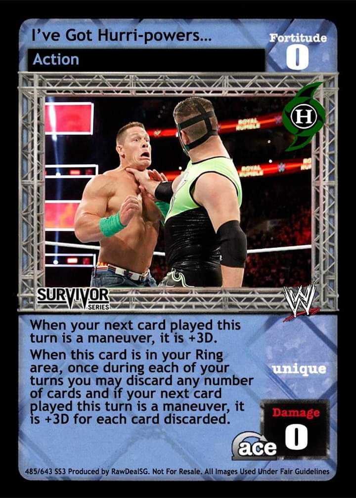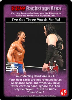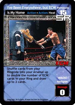 Shuffle cards from your Ringside into your Arsenal up to double the number of ECW cards in your Ring and draw up to 2 cards.
