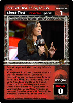 Cannot be packed when packing Sidewalk Slam. When played from hand, reverse any card that has Momentum or 'cannot be reversed'; when you do not have Back to Basics or a BASH card in your Ring, draw up to 1 card and shuffle up to # cards from your Ringside into your Arsenal, where # is the number of your cards in your Backstage Area, Ring, Ringside, or removed from the game with 'Adam Crites Memorial Tournament' in the text +1.