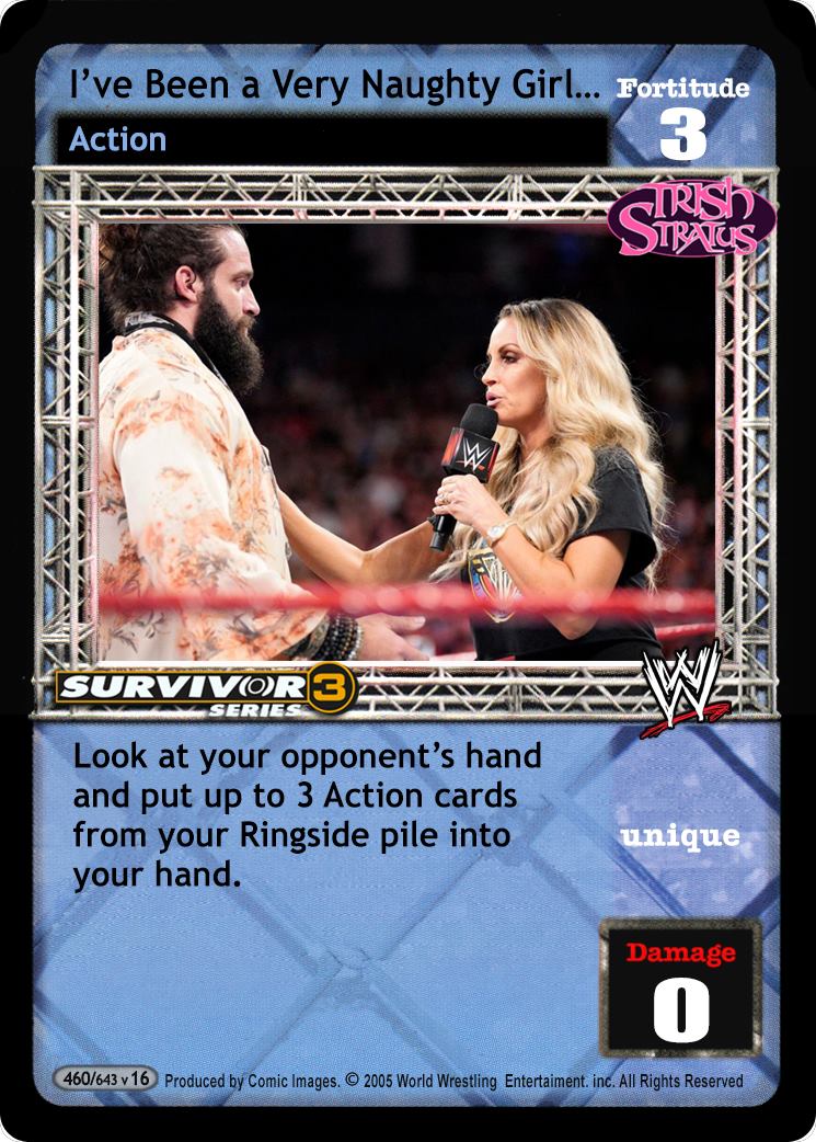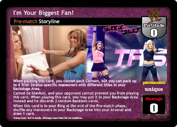 When packing this card, you cannot pack Corners, but you can pack up to 4 Trish Stratus-specific maneuvers with different titles in your Backstage Area. Cannot be blanked, and your opponent cannot prevent you from playing this card. When playing this card, you may put it in your Backstage Area instead and he discards 2 random Backlash cards. When this card is in your Ring, at the end of the Pre-match phase, shuffle any maneuvers in your Backstage Area into your Arsenal and draw 1 card.