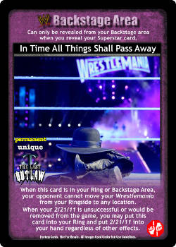 When this card is in your Ring or Backstage Area, your opponent cannot move your Wrestlemania from your Ringside to any location. When your 2/21/11 is unsuccessful or would be removed from the game, you may put this card into your Ring and put 2/21/11 into your hand regardless of other effects.