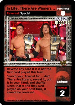Reverse any card if it is not the first card played this turn. Search your Arsenal for ....And There Are Losers, reveal it, put it in your hand, and shuffle; when that is the first card played on your next turn, it cannot be reversed.