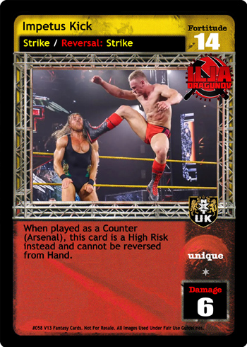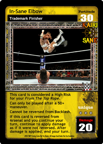 This card is considered a High Risk for your From The Top Rope. Can only be played after a 5D+ maneuver. Cannot be reversed from Backlash. If this card is reversed from Arsenal and you continue your turn, continue to apply damage as if it were not reversed. After damage is applied, end your turn.