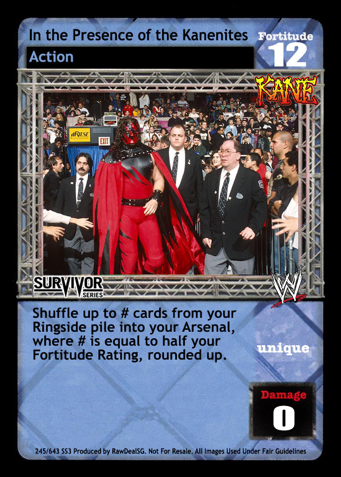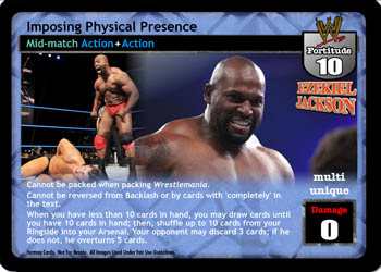 Cannot be packed when packing Wrestlemania. Cannot be reversed from Backlash or by cards with 'completely' in the text. When you have less than 10 cards in hand, you may draw cards until you have 10 cards in hand; shuffle up to 10 cards from your Ringside into your Arsenal. Your opponent may discard 3 cards; if he does not, he overturns 5 cards.