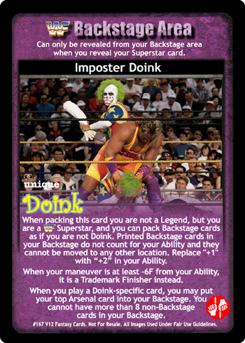 When packing this card you are not a Legend, but you are a [Classic WWF Logo] Superstar, and you can pack Backstage cards as if you are not Doink. Printed Backstage cards in your Backstage do not count for your Ability and they cannot be moved to any other location. Replace '+1' with '+2' in your Ability. When your maneuver is at least -6F from your Ability, it is a Trademark Finisher instead. When you play a Doink-specific card, you may put your top Arsenal card into your Backstage. You cannot have more than 8 non-Backstage Cards in your Backstage.
