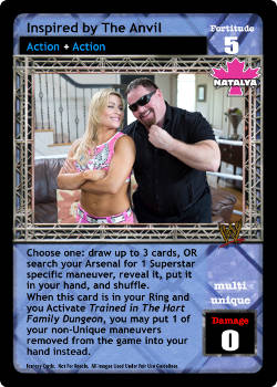 Choose one: draw up to 3 cards, OR search your Arsenal for 1 Superstar-specific maneuver, reveal it, put it in your hand, and shuffle. When this card is in your Ring and you Activate Trained in The Hart Family Dungeon, you may put 1 of your non-Unique maneuvers removed from the game into your hand instead.