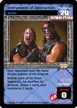 Your opponent puts his hand on the bottom of his Arsenal. Before each of his Draw Segments, he shuffles his Arsenal, draws 1 card, and overturns 2 cards.