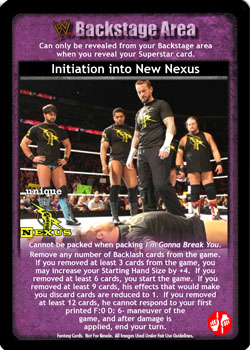Cannot be packed when packing I'm Gonna Break You. Remove any number of Backlash cards from the game. If you removed at least 3 cards from the game, you may increase your Starting Hand Size by +4. If you removed at least 6 cards, you start the game. If you removed at least 9 cards, his effects that would make you discard cards are reduced to 1. If you removed at least 12 cards, he cannot respond to your first printed F:0 D:6- maneuver played of the game, and after its damage is applied, end your turn.