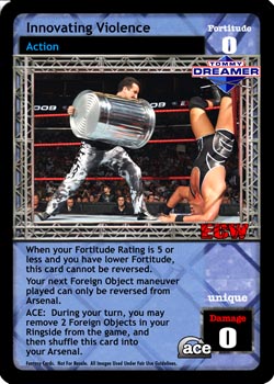 When your Fortitude Rating is 5 or less and you have lower Fortitude, this card cannot be reversed. Your next Foreign Object maneuver played this turn can only be reversed from Arsenal. ACE: During your turn, you may remove 2 Foreign Objects in your Ringside from the game, and then shuffle this card into your Arsenal.