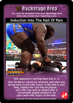 Your opponent's Starting Hand Size is -2. Your No Mercy cannot be reversed, and when you do not have a card with 'injury' in the title in your Ring, replace the 'Can only be played...' text with 'Can only be played after a successfully played maneuver' on your cards with 'injury' in the title.