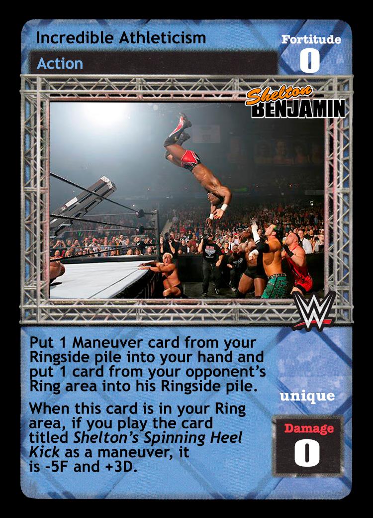 Put 1 Maneuver card from your Ringside pile into your hand and put 1 card from your opponent's Ring area into his Ringside pile. When this card is in your Ring area, if you play the card titled Shelton's Spinning Heel Kick as a maneuver, it is -5F and +3D.