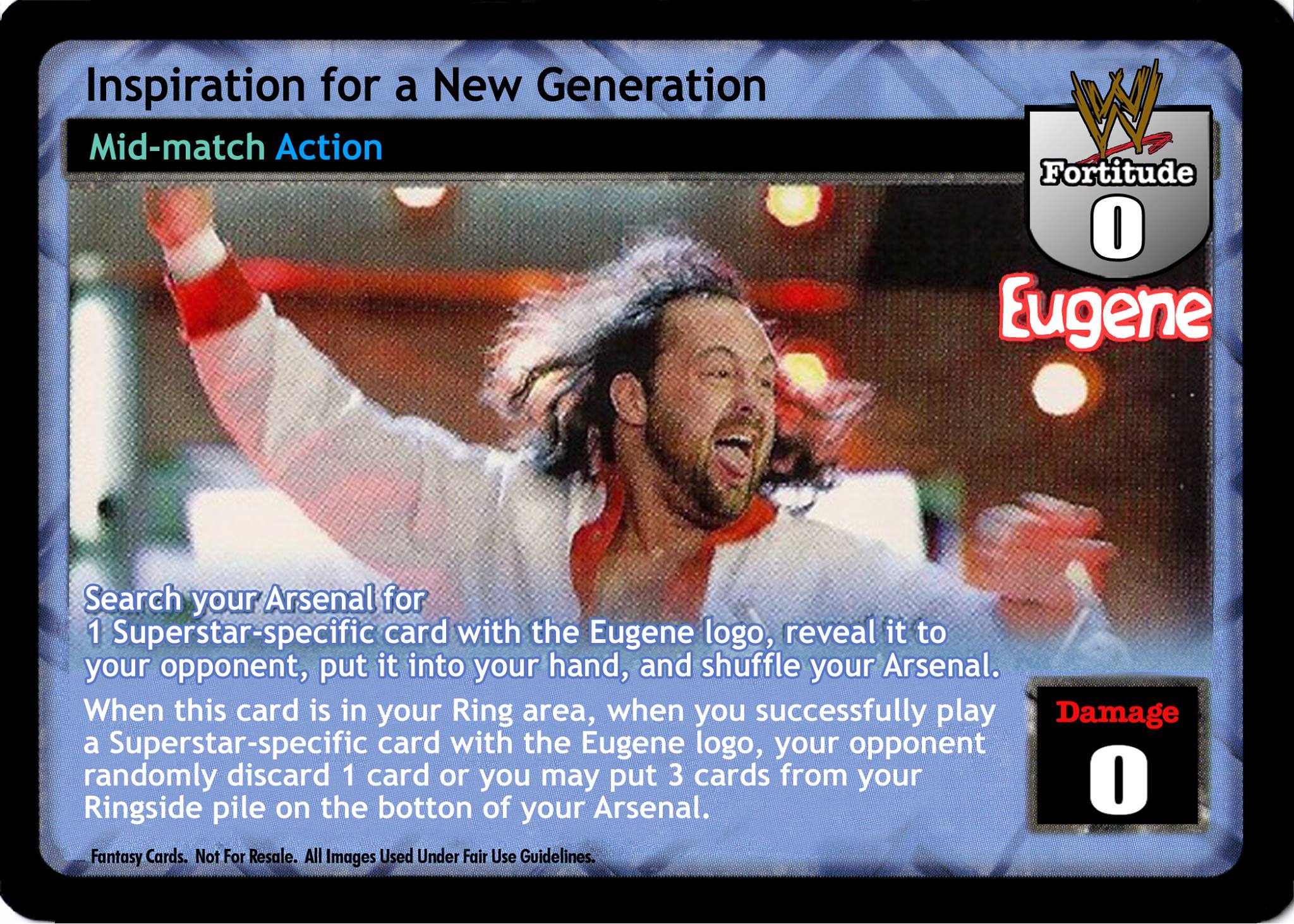 Search your Arsenal for 1 Superstar-specific card with the Eugene logo, reveal it to your opponent, put it into your hand, and shuffle your Arsenal. When this card is in your Ring area, when you successfully play a Superstar-specific card with the Eugene logo, your opponent randomly discards 1 card or you may put 3 cards from your Ringside pile on the bottom of your Arsenal.