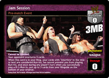 Cannot be blanked. Your opponent overturns 3 cards. When this card is in your Ring, your cards with 'interfere' in the title or text are considered Run-ins, he cannot prevent you from playing Run-ins, and once during any player's turn when you successfully play a D:1+ Run-in, put up to 3 cards from your Ringside on the bottom of your Arsenal.