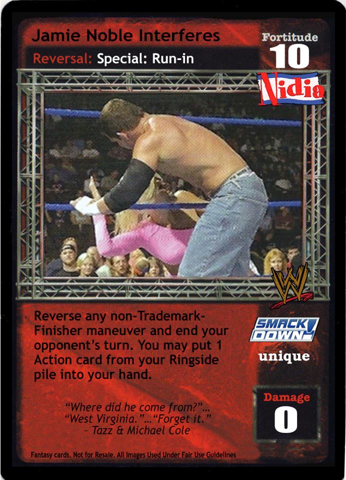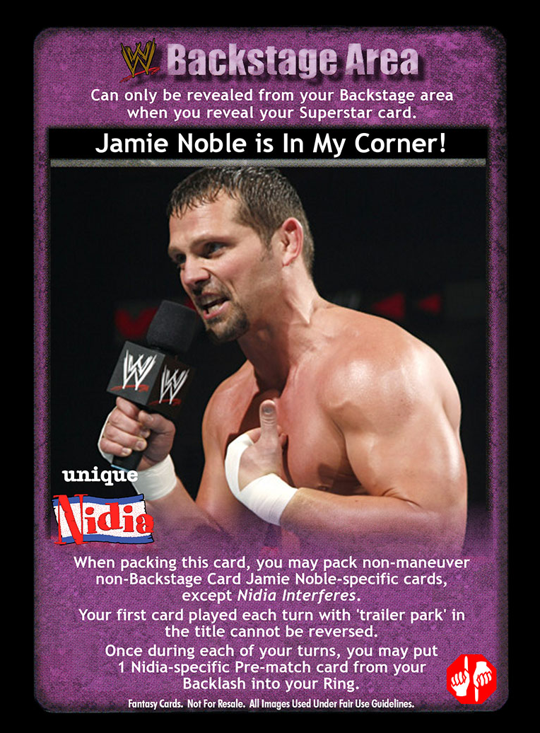 When packing this card, you may pack non-maneuver non-Backstage Card Jamie Noble-specific cards, except Nidia Interferes. Your first card played each turn with 'trailer park' in the title cannot be reversed. Once during each of your turns, you may put 1 Nidia-specific Pre-match card from your Backlash into your Ring.