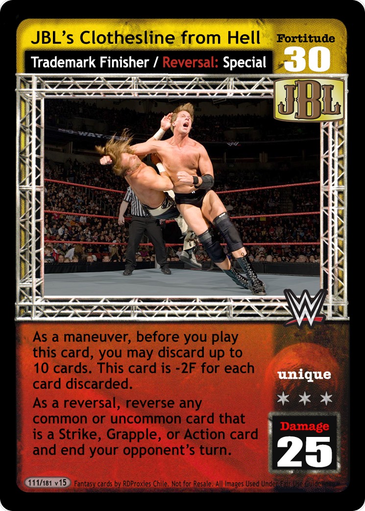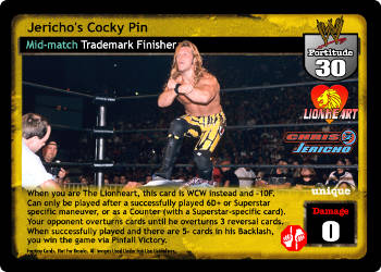 When you are The Lionheart, this card is WCW instead and -10F. Can only be played after a successfully played 6D+ or Superstar-specific maneuver, or as a Counter (with a Superstar-specific card). Your opponent overturns cards until he overturns 3 reversal cards. When successfully played and there are 5- cards in his Backlash, you win the game via Pinfall Victory.