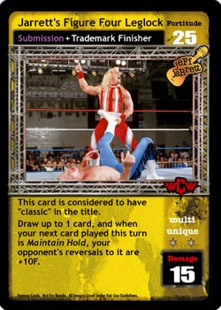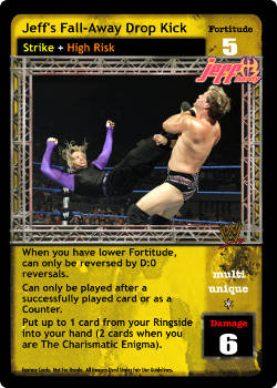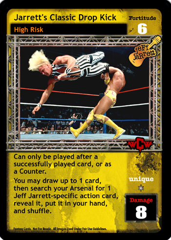 Can only be played after a successfully played card, or as a Counter (non-Arsenal). You may draw up to 1 card, then search for 1 Jeff Jarrett-specific action card, reveal it, put it in your hand, and shuffle.