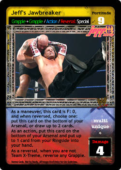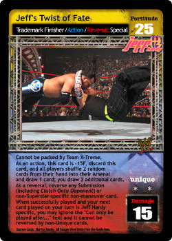 Cannot be packed by Team X-Treme. As an action, this card is -15F, discard this card, and all players shuffle 2 random cards from their hand into their Arsenal and draw 1 card; you draw 2 additional cards. As a reversal, reverse any Submission (including Clutch onto Opponent) or non-Superstar-specific non-maneuver card. When successfully played and your next card played on your turn is Jeff Hardy-specific, ignore the 'Can only be played after...' text and it cannot be reversed by non-Unique cards.